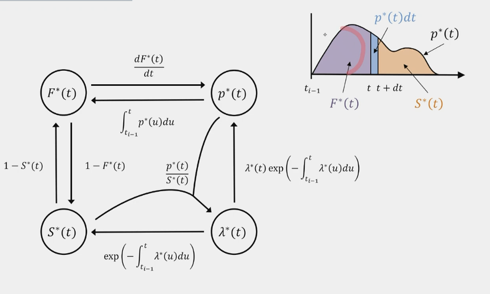 - The next event in \([t, t + dt]\) is \(p^*(t) \, dt\) and there is no event before \(t\)