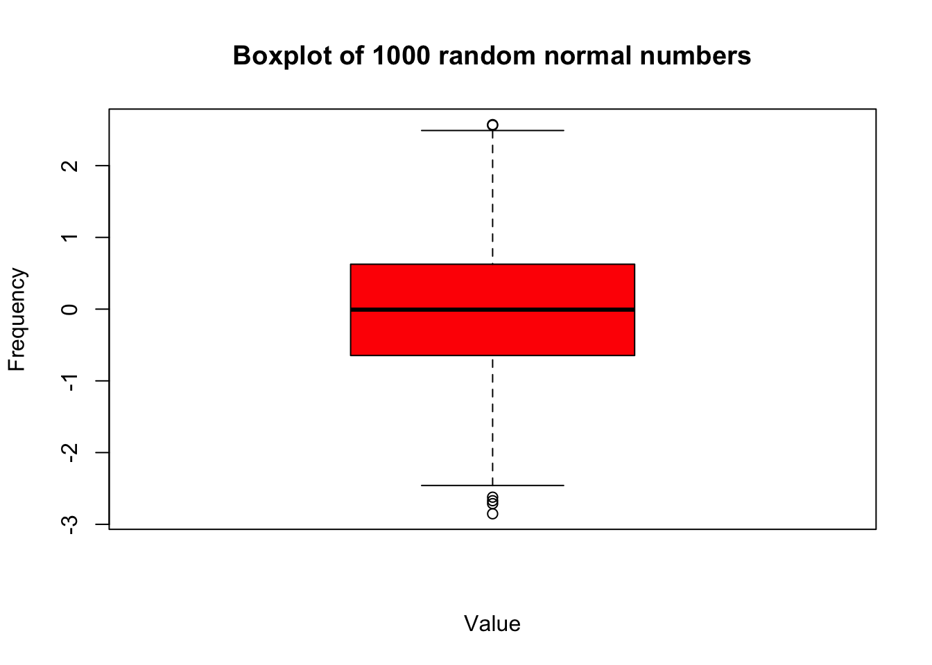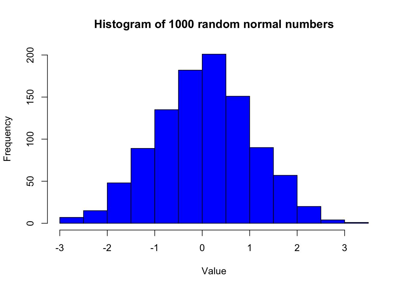 hist(rnorm(1000), col = "blue", main = "Histogram of 1000 random normal numbers", xlab = "Value", ylab = "Frequency")