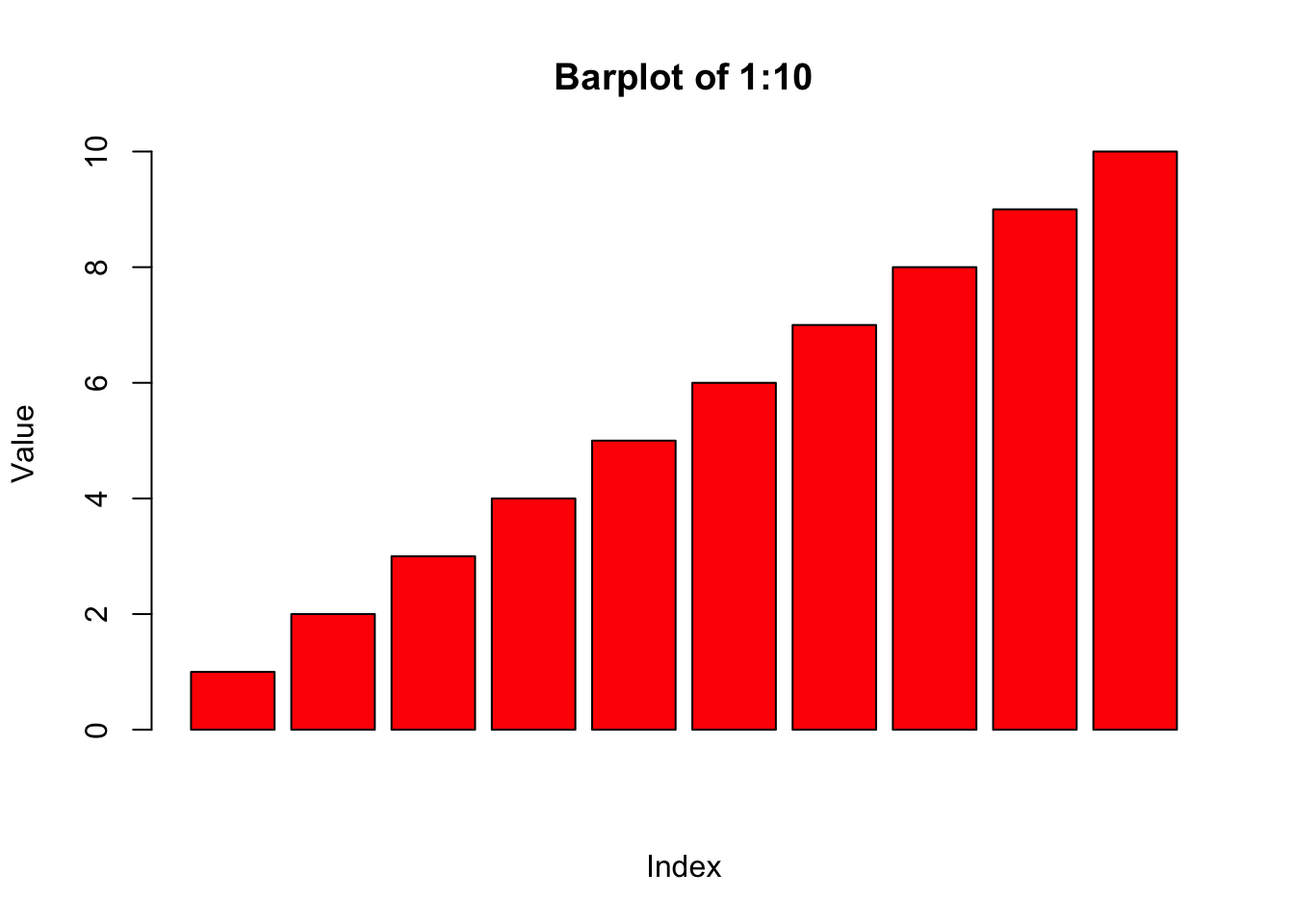 barplot(1:10, col = "red", main = "Barplot of 1:10", xlab = "Index", ylab = "Value")