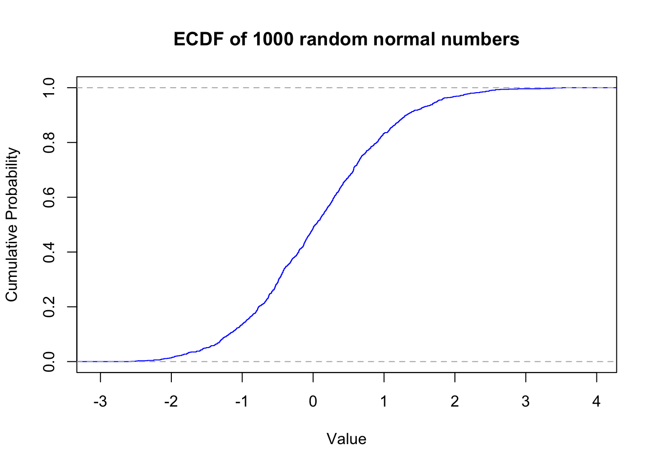 plot.ecdf(rnorm(1000), col = "blue", main = "ECDF of 1000 random normal numbers", xlab = "Value", ylab = "Cumulative Probability")