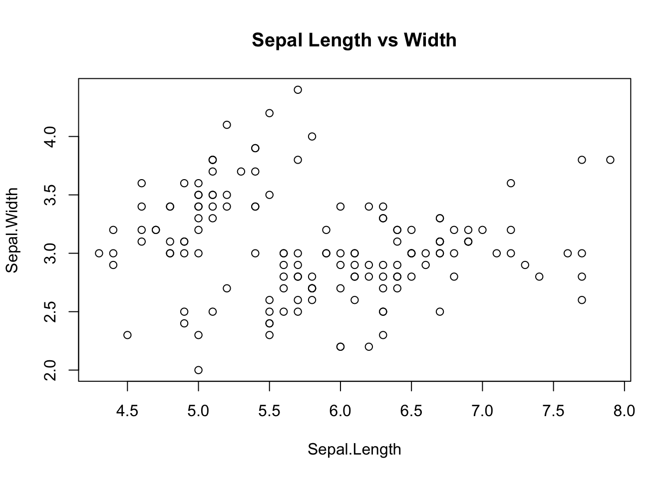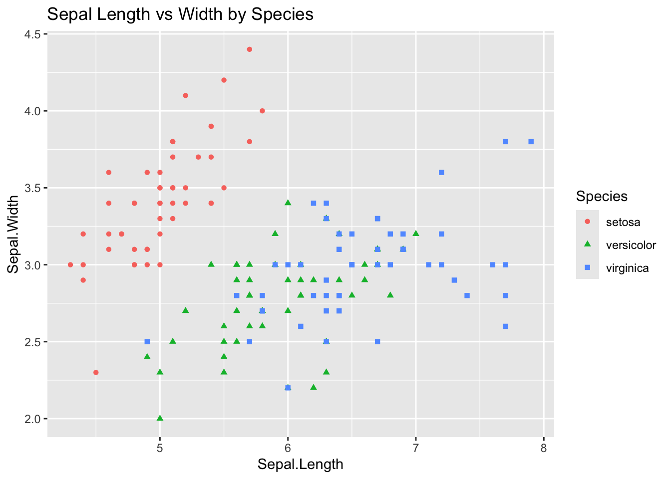# Scatter plot of iris datasetggplot(data = iris, aes(x = Sepal.Length, y = Sepal.Width, color = Species, shape = Species)) +geom_point() +ggtitle("Sepal Length vs Width by Species")