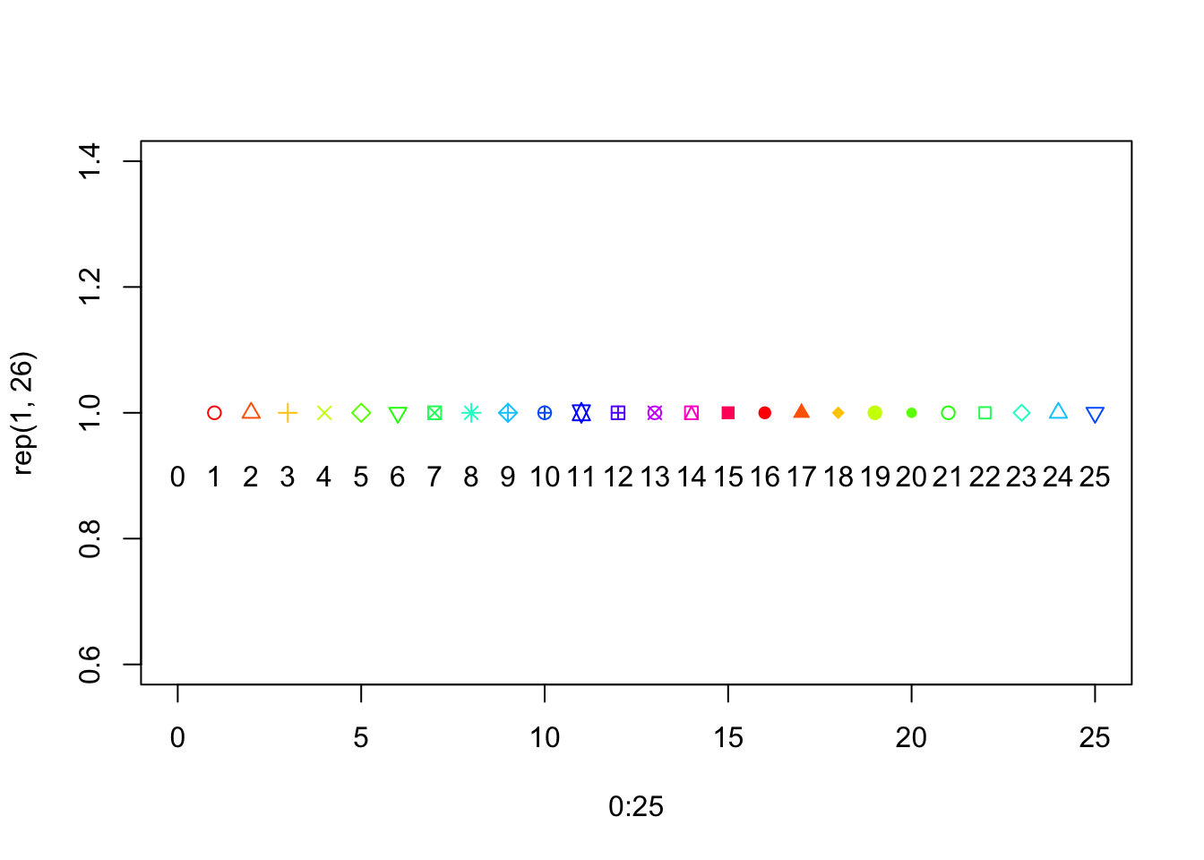 plot(0:25, rep(1, 26), pch =0:25, col =0:25)text(0:25, 0.9, 0:25)
