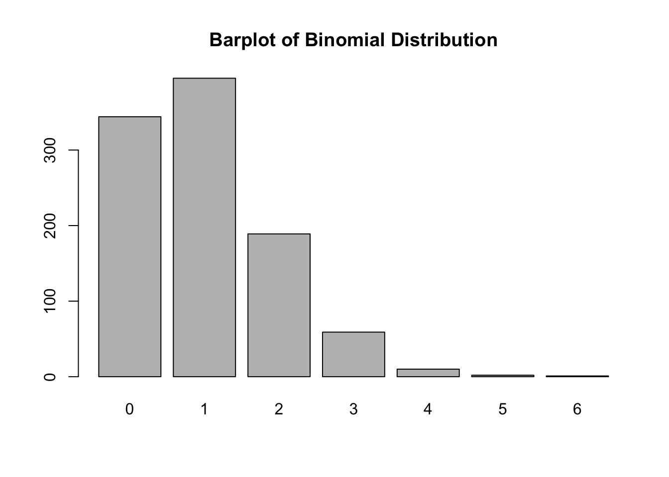 # Example of barplot using rbinomx <-rbinom(1000, 10, 0.1)barplot(table(x), main ="Barplot of Binomial Distribution")# ggplot2 exampleslibrary(ggplot2)