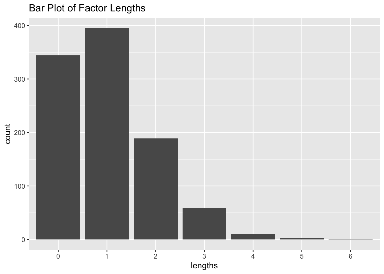 # Bar plotdf <-data.frame(lengths =factor(x))ggplot(df, aes(lengths)) +geom_bar() +ggtitle("Bar Plot of Factor Lengths")
