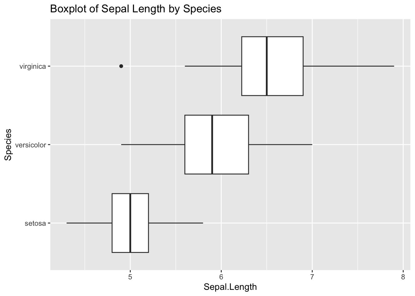 # Boxplot and Violin plot of Sepal Length by Speciesggplot(iris, aes(Species, Sepal.Length)) +geom_boxplot() +coord_flip() +ggtitle("Boxplot of Sepal Length by Species")