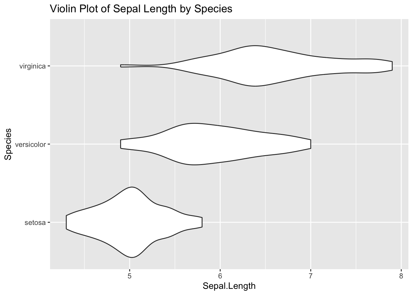 ggplot(iris, aes(Species, Sepal.Length)) +geom_violin() +coord_flip() +ggtitle("Violin Plot of Sepal Length by Species")