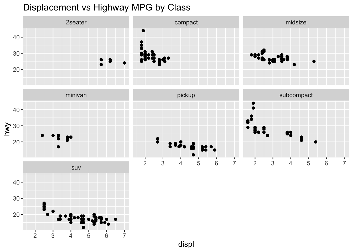 # Multiple plots using facet_wrapggplot(mpg, aes(displ, hwy)) +geom_point() +facet_wrap(~class) +ggtitle("Displacement vs Highway MPG by Class")