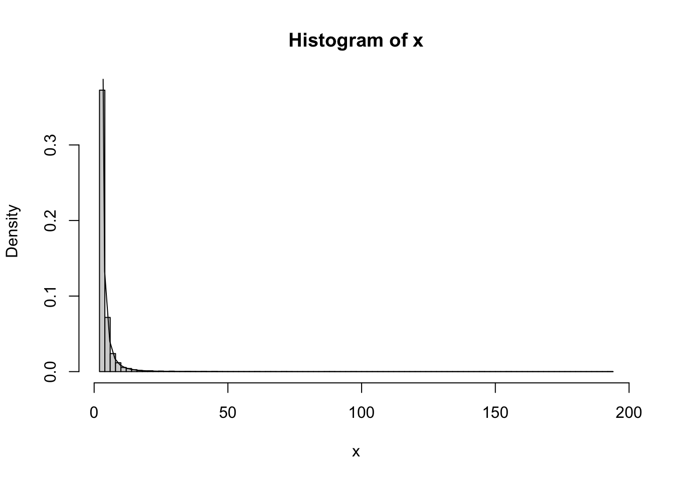 n =10000a =2b =2u =runif(n)x = b / (1- u)^(1/a)hist(x, prob =TRUE, breaks =100)curve(a * b^a / x^(a+1), add =TRUE)