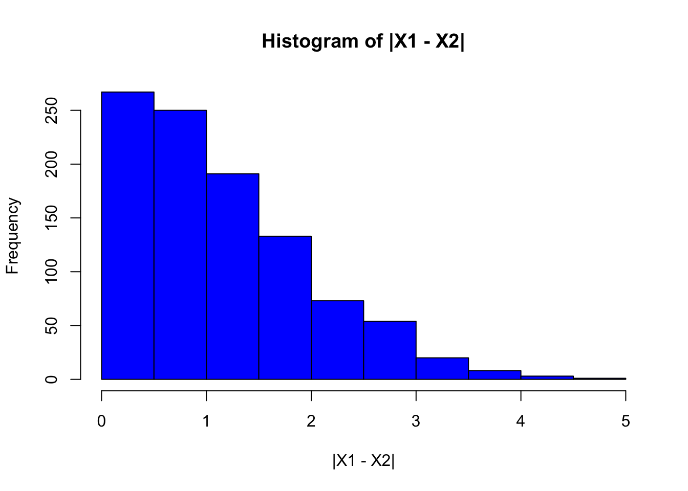 set.seed(1981)m <-10^3normals <-matrix(rnorm(2* m), ncol =2)g <-abs(normals[, 1] - normals[, 2])mean_g <-mean(g)hist(g, col ="blue", main ="Histogram of |X1 - X2|", xlab ="|X1 - X2|")