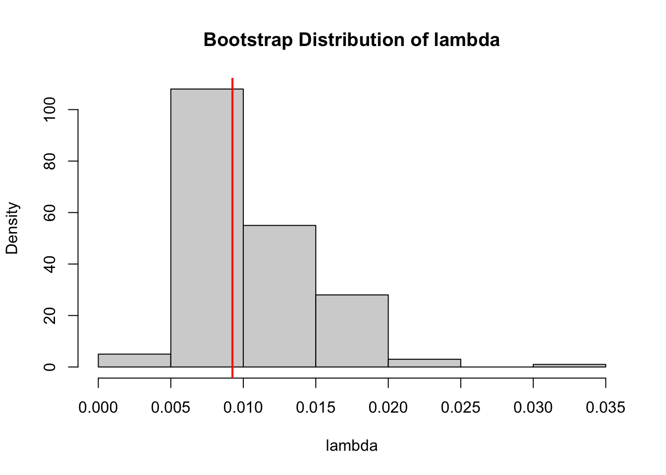 hist(lambda_b, prob = TRUE, main = "Bootstrap Distribution of lambda", xlab = "lambda")