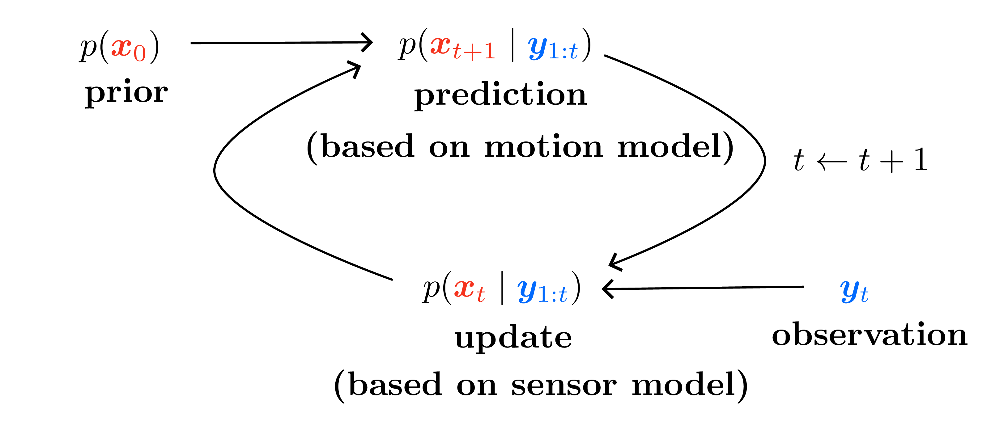 Belief \(p(x_t\mid y_{1:t}) = \mathcal{N}(\mu_t,\Sigma_t)\).