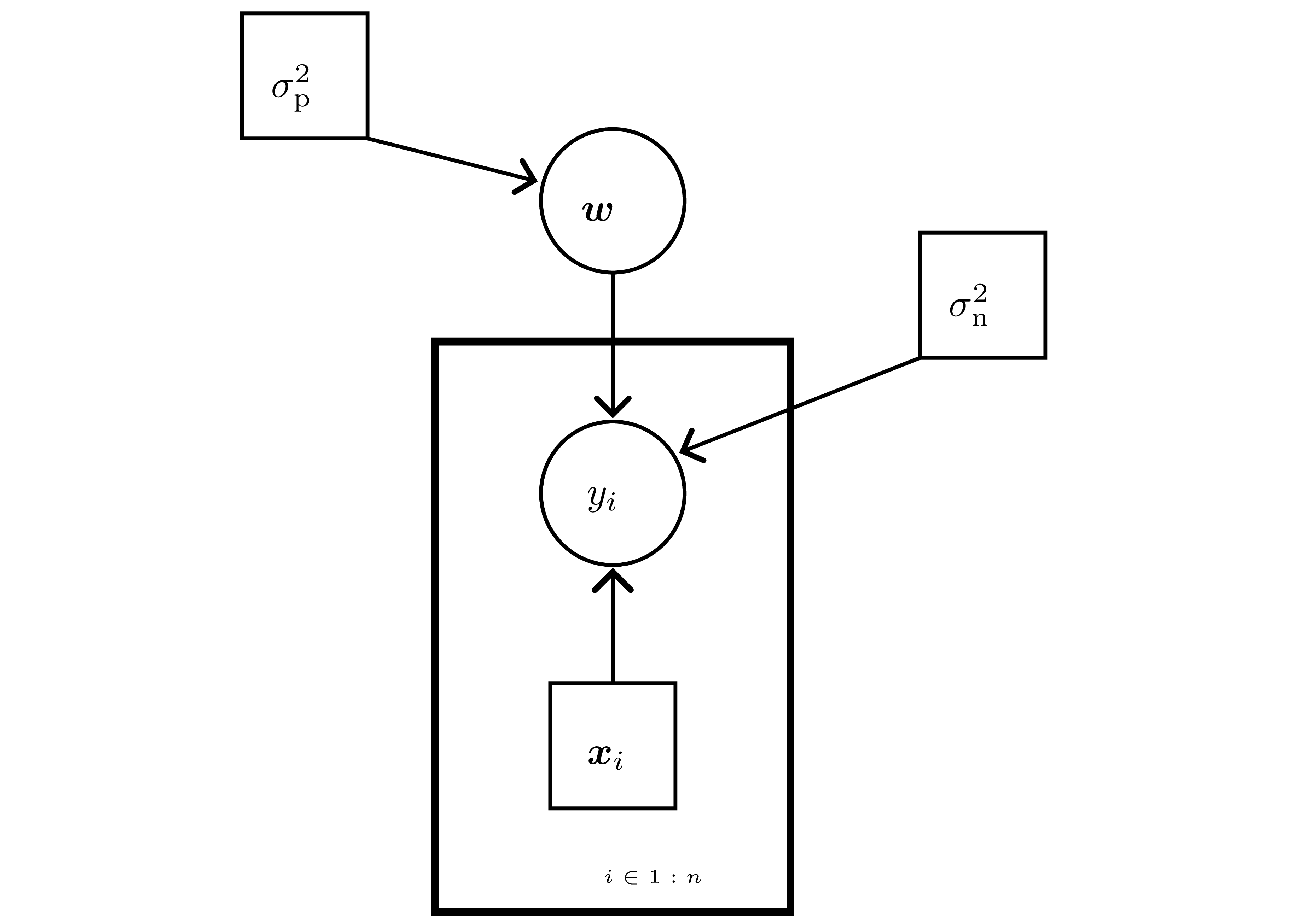 - Likelihood \(p(\mathbf{y}\mid\mathbf{w})=\prod_{i=1}^n \mathcal{N}(y_i\mid\mathbf{x}_i^\top\mathbf{w},\sigma_n^2)\) — Gaussian noise \(\varepsilon_i\sim\mathcal{N}(0,\sigma_n^2)\).