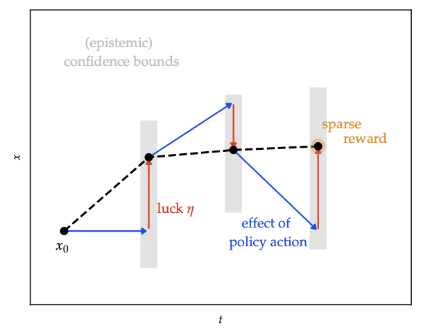 - Optimism: introduce “luck” variables \(\eta\) to allow transitions within confidence bounds that favour high reward; ensures optimistic value estimates until uncertainty shrinks.