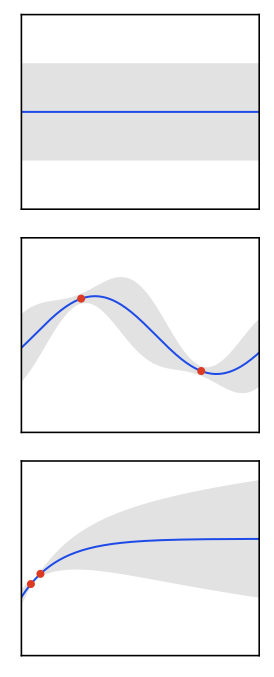- Predictive mean \(\mu'(x)=k(x,\mathbf{X})^{\top}(\mathbf{K}+\sigma_n^2 I)^{-1}\mathbf{y}\), predictive variance \(k'(x,x)=k(x,x)-k(x,\mathbf{X})^{\top}(\mathbf{K}+\sigma_n^2 I)^{-1}k(x,\mathbf{X})\).