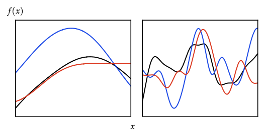 - Transform features with \(\boldsymbol{\phi}(x)\) (possibly infinite). Weight prior induces function prior: \[ f\mid\mathbf{X} \sim \mathcal{N}(0,\mathbf{K}),\quad K_{ij}=\sigma_p^2\,\boldsymbol{\phi}(\mathbf{x}_i)^\top\boldsymbol{\phi}(\mathbf{x}_j) = k(\mathbf{x}_i,\mathbf{x}_j). \]