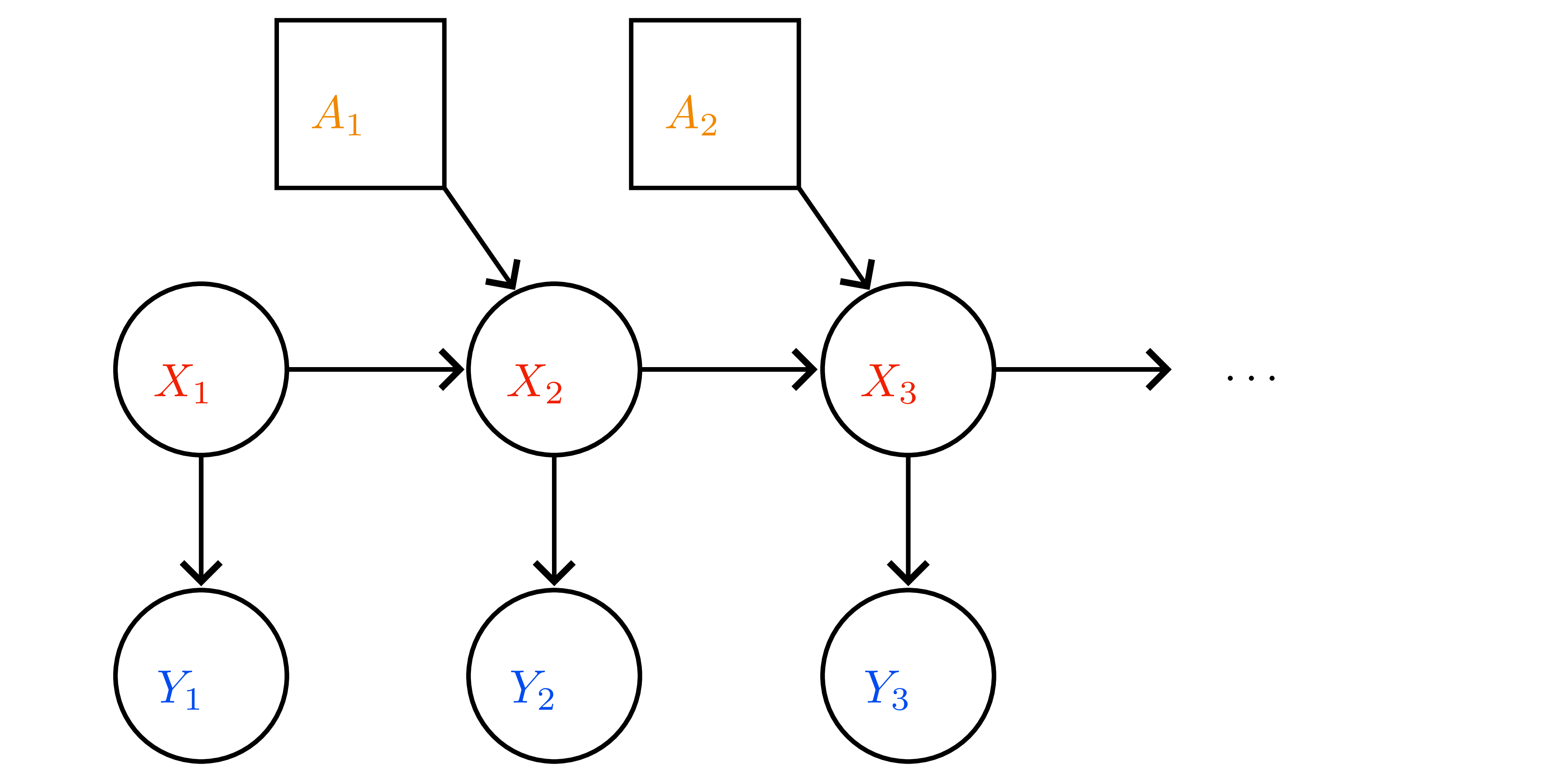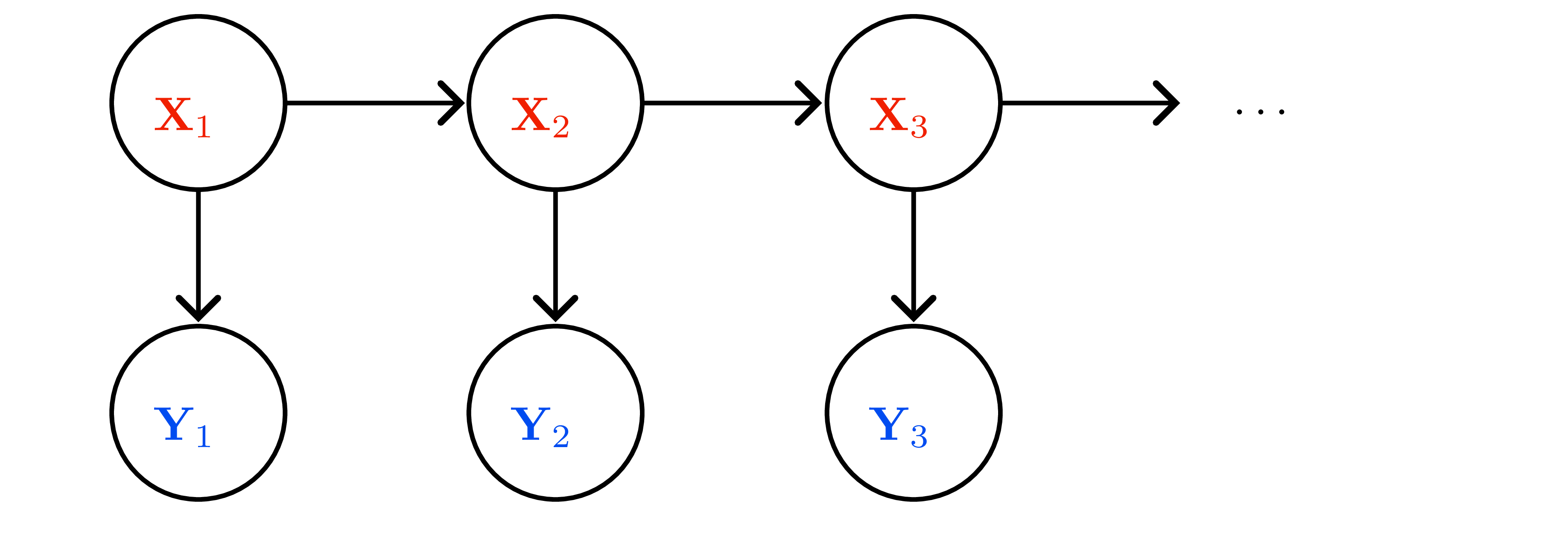 - Latent state \(x_t\in\mathbb{R}^d\), observation \(y_t\in\mathbb{R}^m\).