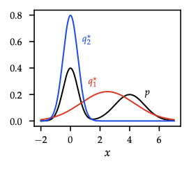 - KL divergence \(\mathrm{KL}(p\|q)=\mathbb{E}_p\big[\log\frac{p}{q}\big]\ge0\); forward KL is mode-covering, reverse KL is mode-seeking.