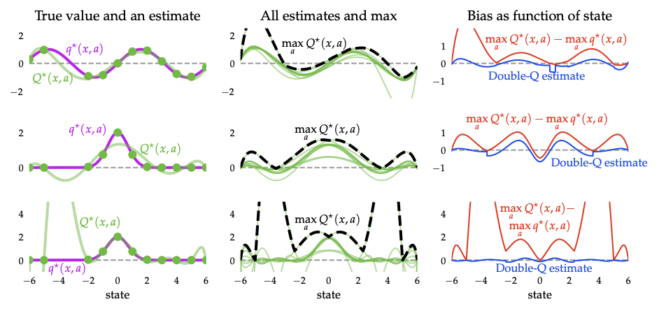 - Maximization bias: \(\max\) of noisy estimates overestimates true values. Double DQN fixes this via decoupled action selection/evaluation: target \(r + \gamma Q(x',\arg\max_{a'}Q(x',a';\theta);\theta^{-})\); side-by-side sweep below shows the over-optimism gap.