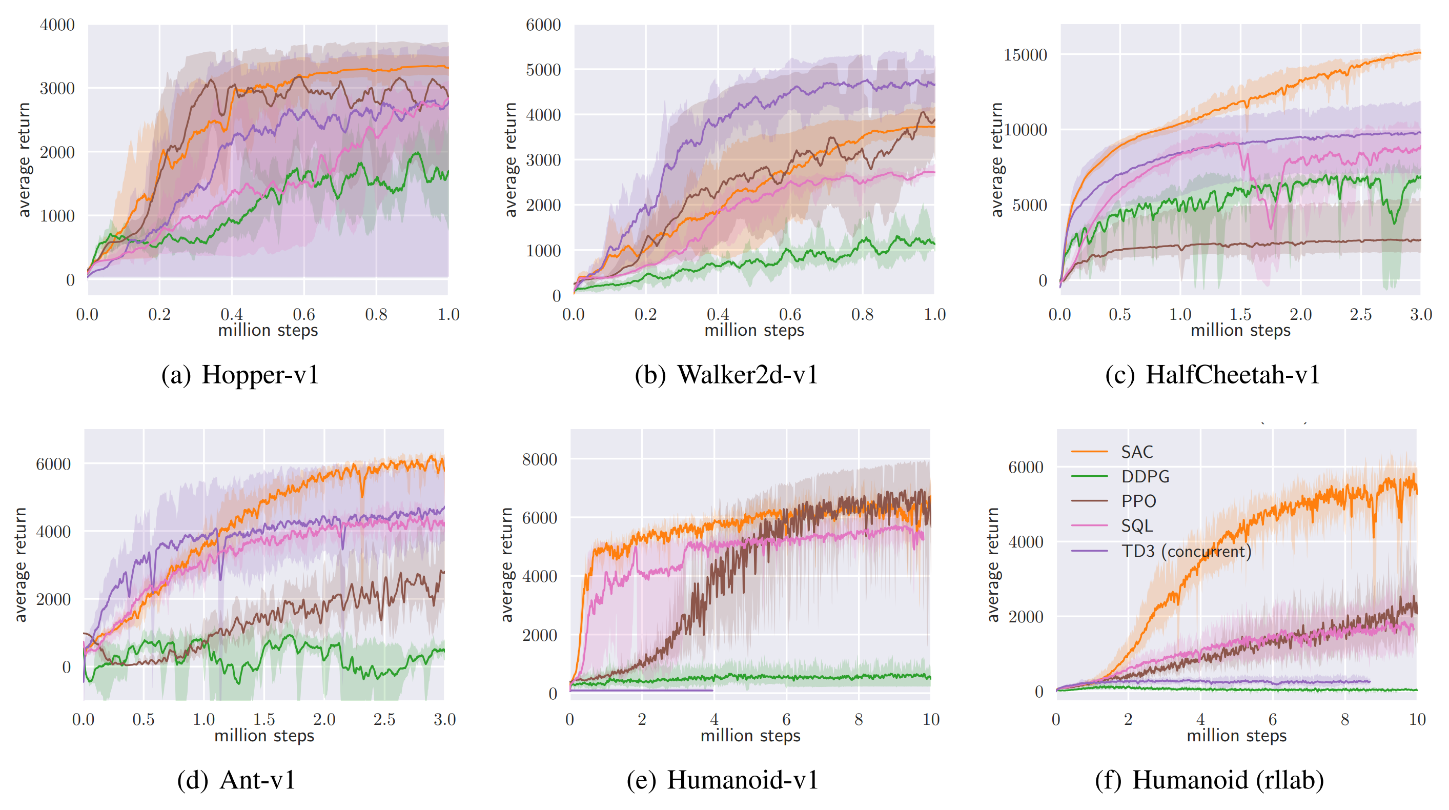 - Soft Bellman backups: \(Q(s,a)=r+\gamma\mathbb{E}_{s'}[V(s')]\), \(V(s)=\alpha\log\int \exp(Q(s,a)/\alpha)da\).