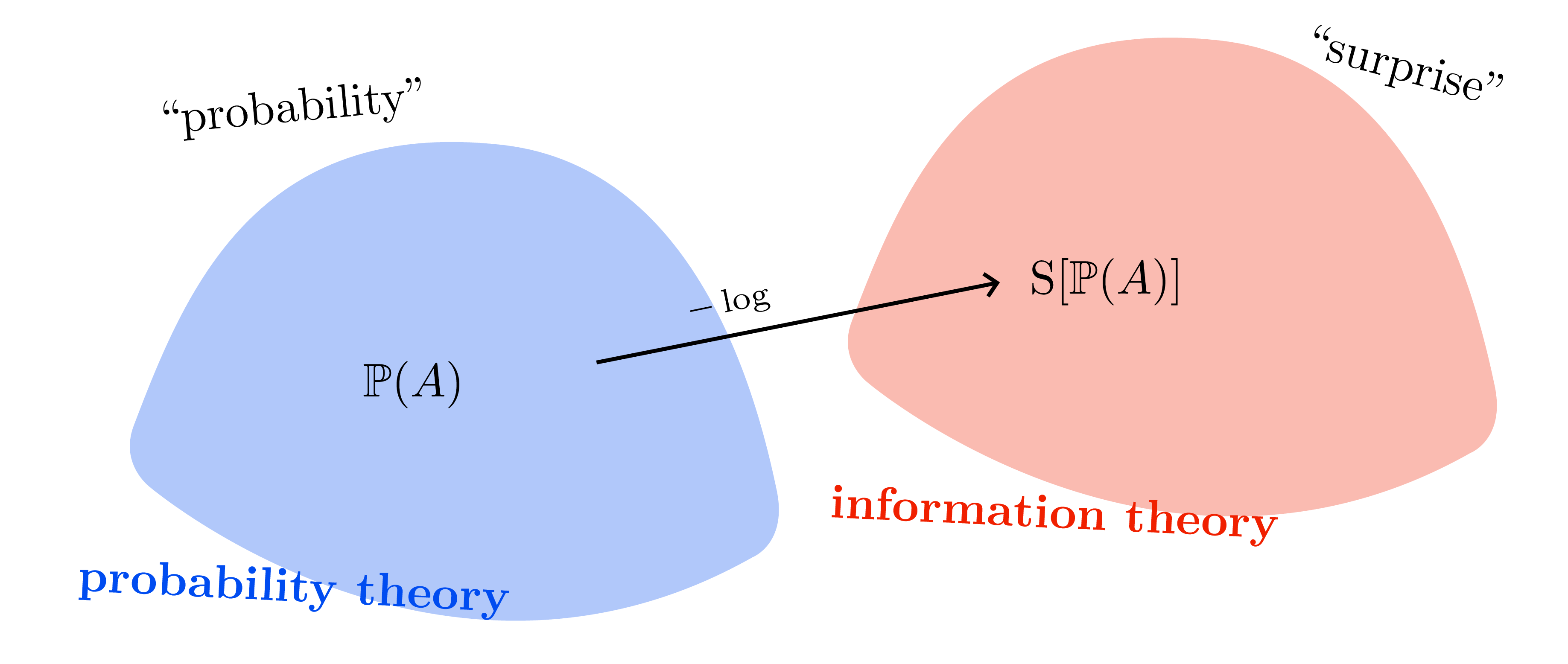 - Surprise \(\mathcal{S}(u)=-\log u\); entropy \(H(p)=\mathbb{E}_p[-\log p(X)]\) measures average surprise.