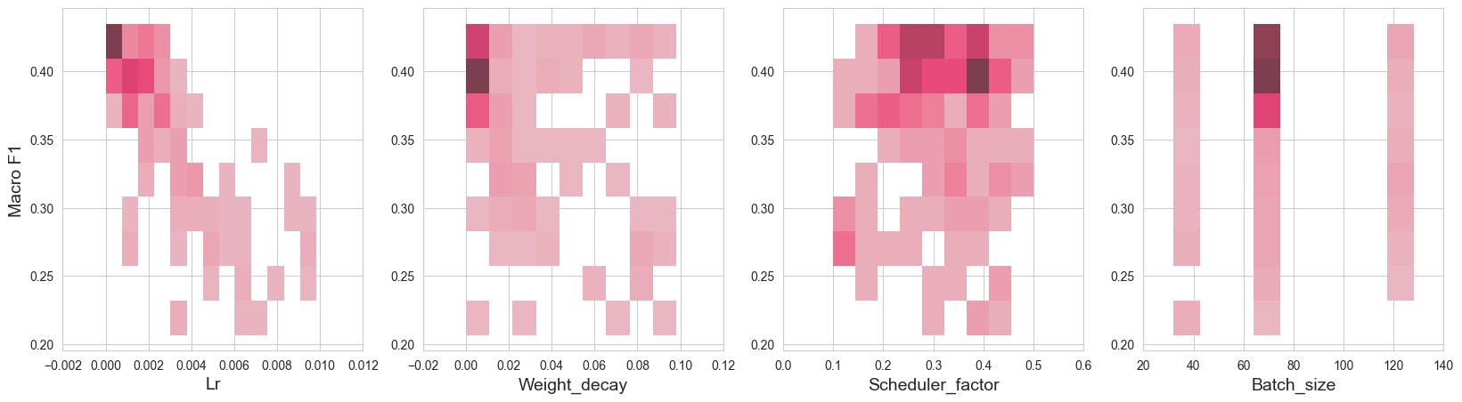 fig, axs = ["lr", "weight_decay", "scheduler_factor", "batch_size"]