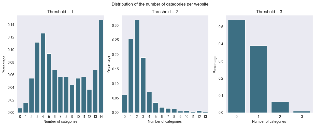 f"For threshold = 3, the mean number of categories per website is {numlab_dist[2].mean():.2f}"